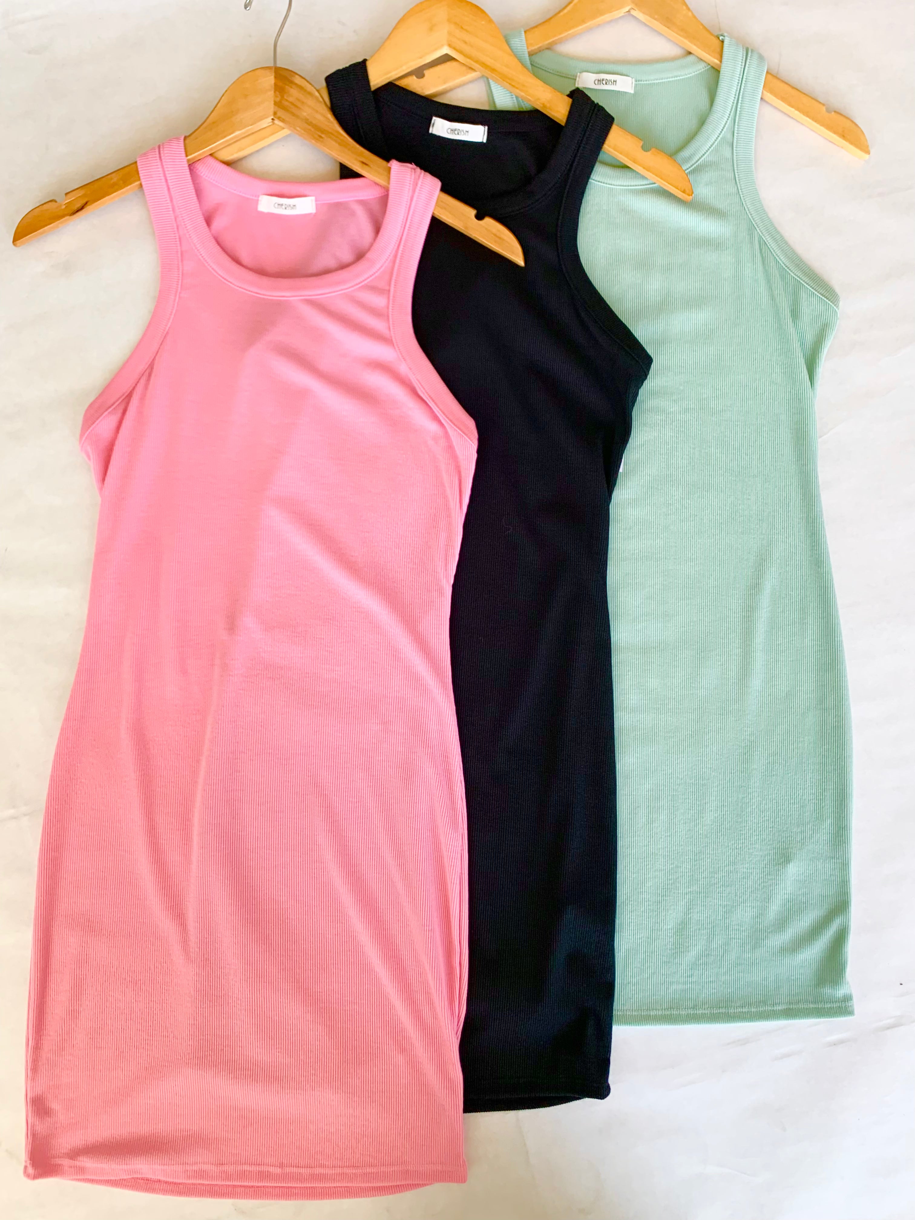 Sleeveless tank dress with hi low back rounded hem. Simple but perfect to wear alone or layer with bralettes or cardigans.