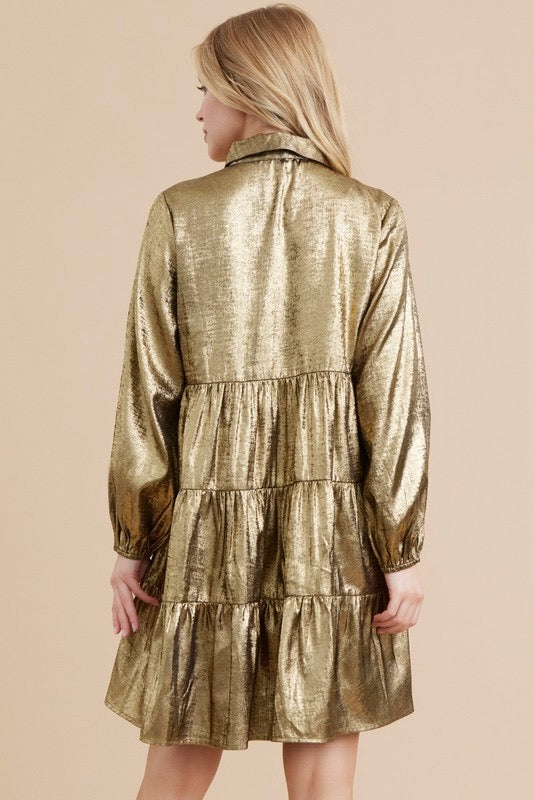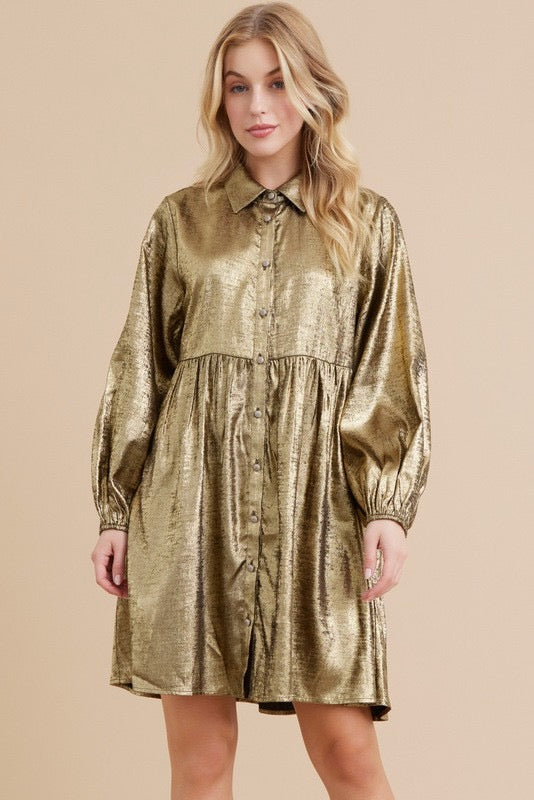 Metallic baby doll dress with collared neck, long bubble sleeves, and tiered layer. - Button-front, non-sheer, lightweight. - Model is 5'8'' and is wearing a Small. Fabric 95% POLYESTER 5% SPANDEX Color: Taupe Gold, Black Gold or Pink Length: 35" Shoulder...