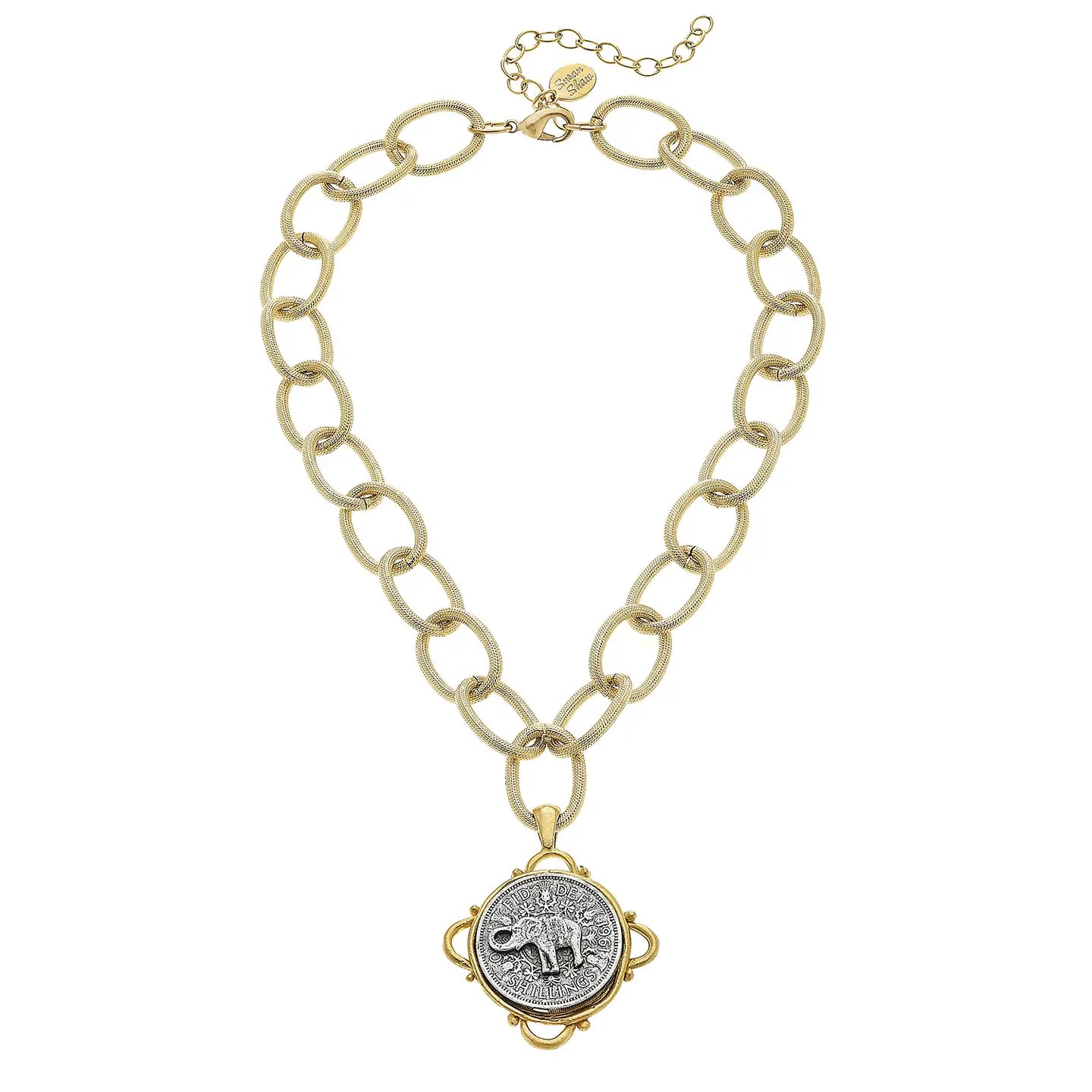 Embrace elegance with the Handcast Gold and Silver Elephant Necklace by Susan Shaw. This pendant/charm necklace is a unique representation of Susan Shaw's commitment to designing elegant jewelry for over three decades. Inspired by Northern European styling and American-made materials,...