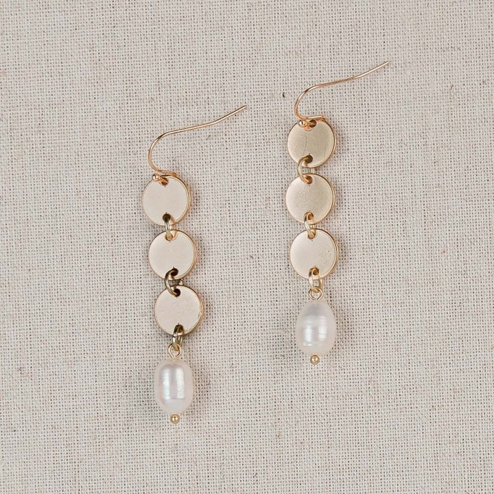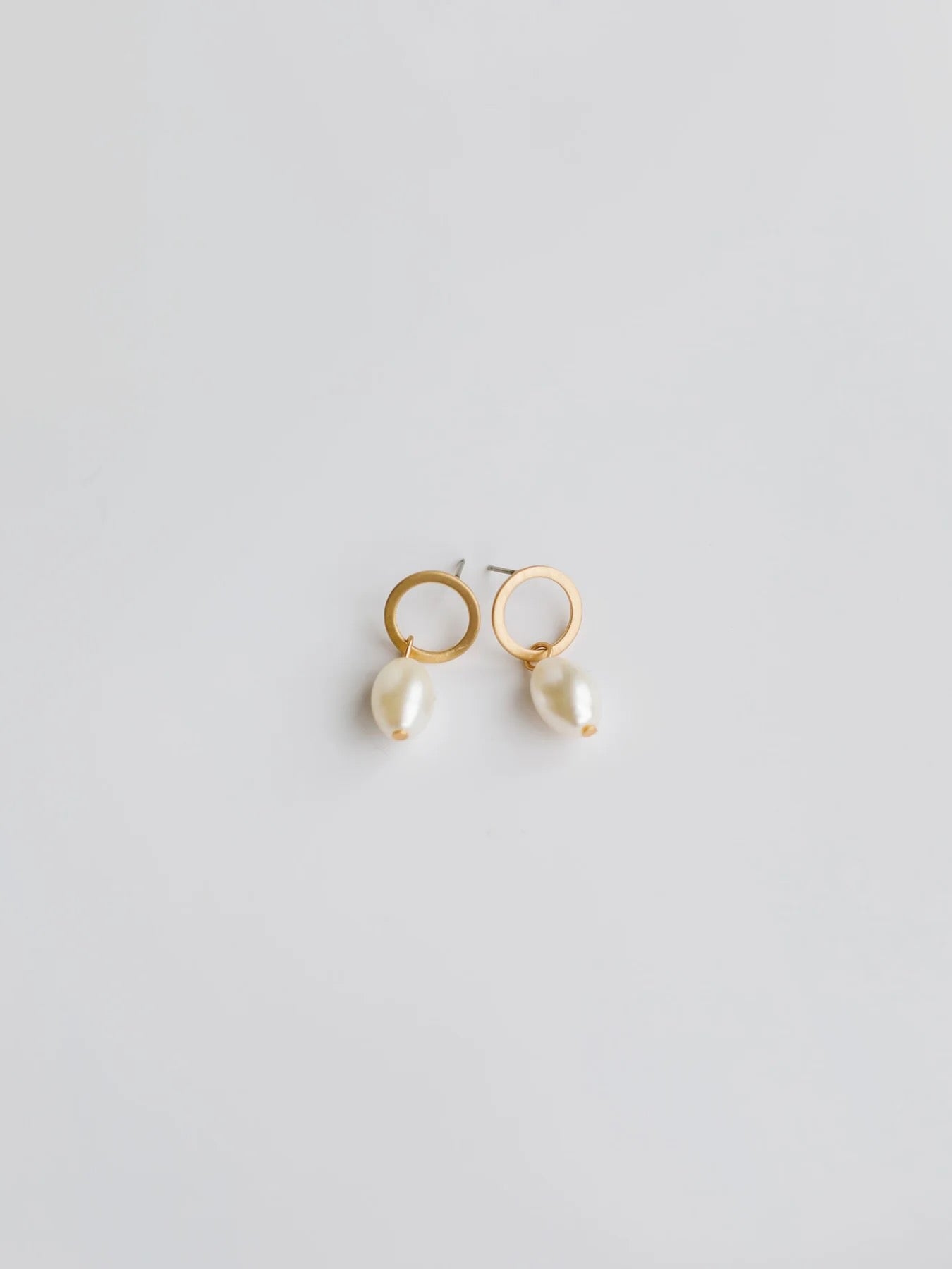 Brass plated matte gold circle drop earrings with freshwater pearl charm