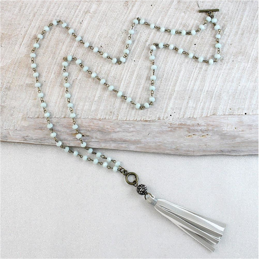 This convertible necklace features a vintage style chain of black beads, with a hematite bead and gray tassel accent. This necklace can be worn long at 36" or doubled with a toggle clasp at 18".