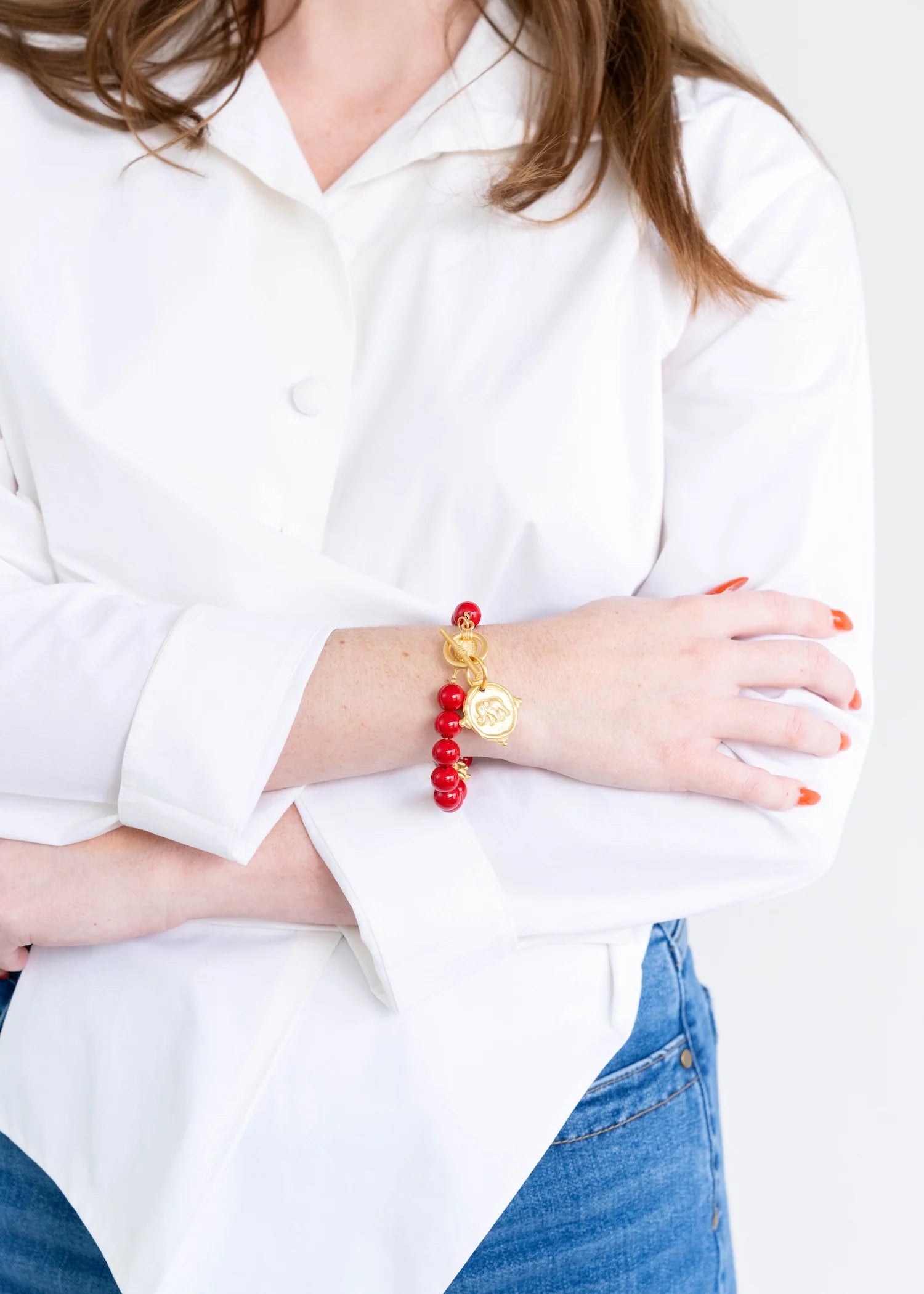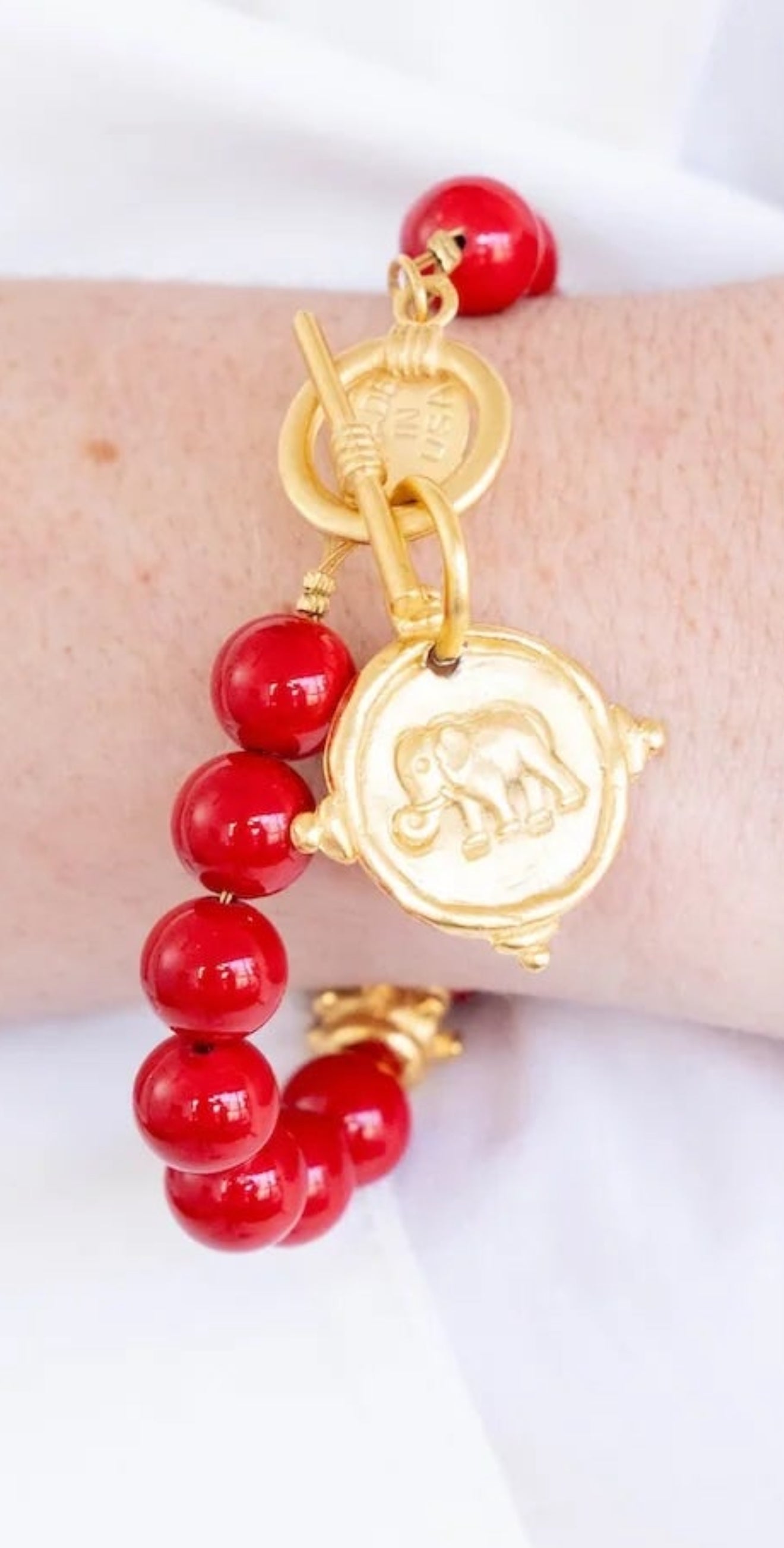 9" l x 0.5" w, charm: 1" l x 1" w, toggle closure. Set on a red coral bracelet with our ever-popular toggle clasp, the Gold Elephant Intaglio Red Coral Bracelet is sure to become a staple in your Susan...