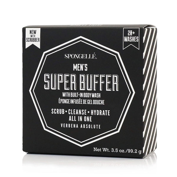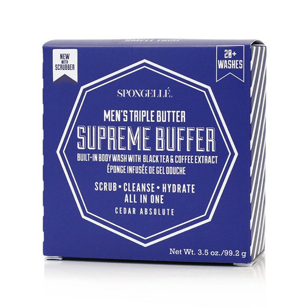 Introducing our enhanced Men's Body Buffer Assorted Pack, now featuring an innovative dual-sided black scrubber for an invigorating and effective exfoliation experience. Spongelle Men's Assorted Pack includes 3 of each of our 3 fragrances: Verbena Absolute - Super Buffer, Bergamot Absolute - Extreme Buffer, Cedar Absolute - Supreme Buffer. Good for 20+ uses.