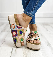 These boho-chic platform slides exude effortless summer style. The wide strap features intricate woven detailing in a natural beige hue, accented with subtle gold threads for a touch of shimmer. The braided platform sole adds texture and height, offering a...