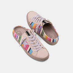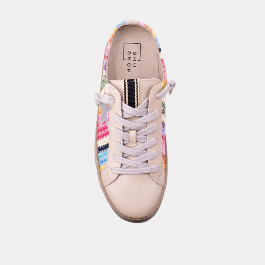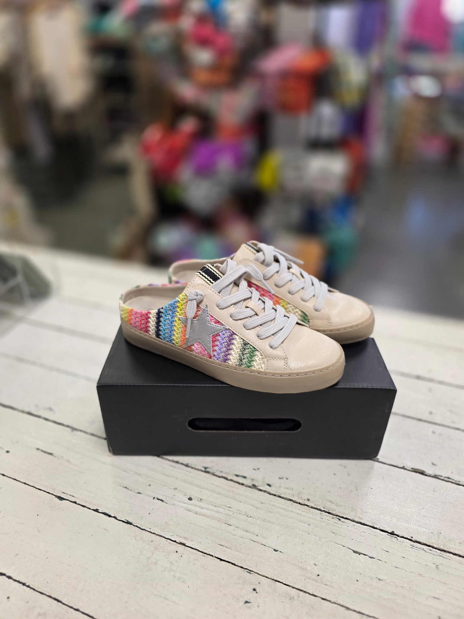 Step into effortless style with the POLKA in Bright Multi Stripe, a mule-style sneaker that's as bold as it is comfortable. Featuring a vibrant rainbow-woven design and a metallic silver star accent, this pair adds a playful yet chic touch...