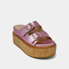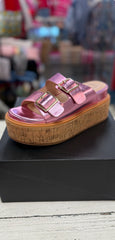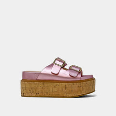 Our new addition, LUCINDA, features buckles that add a gleaming signature to the dual-strap upper of this dreamy metallic pink faux buttery leather slide sandal. It floats on a cushy memory foam footbed and a timeless cork-wrapped wedge platform. Wear...