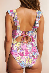 Floral V Neck Lace-Up Back Tummy Control One Piece Swimsuit