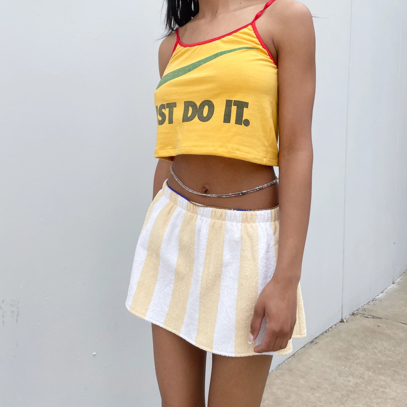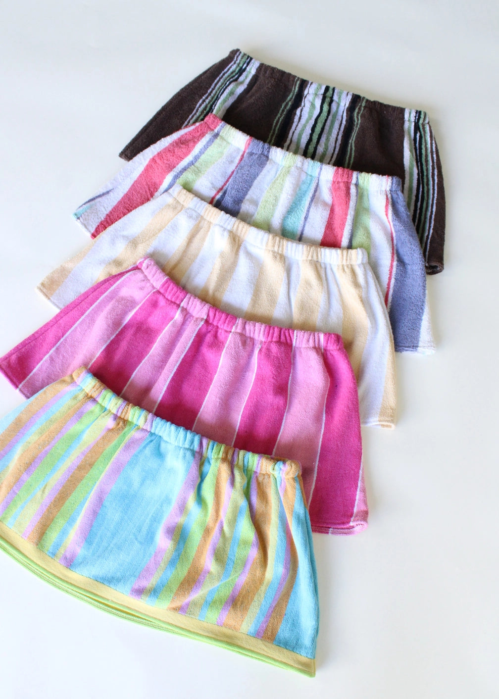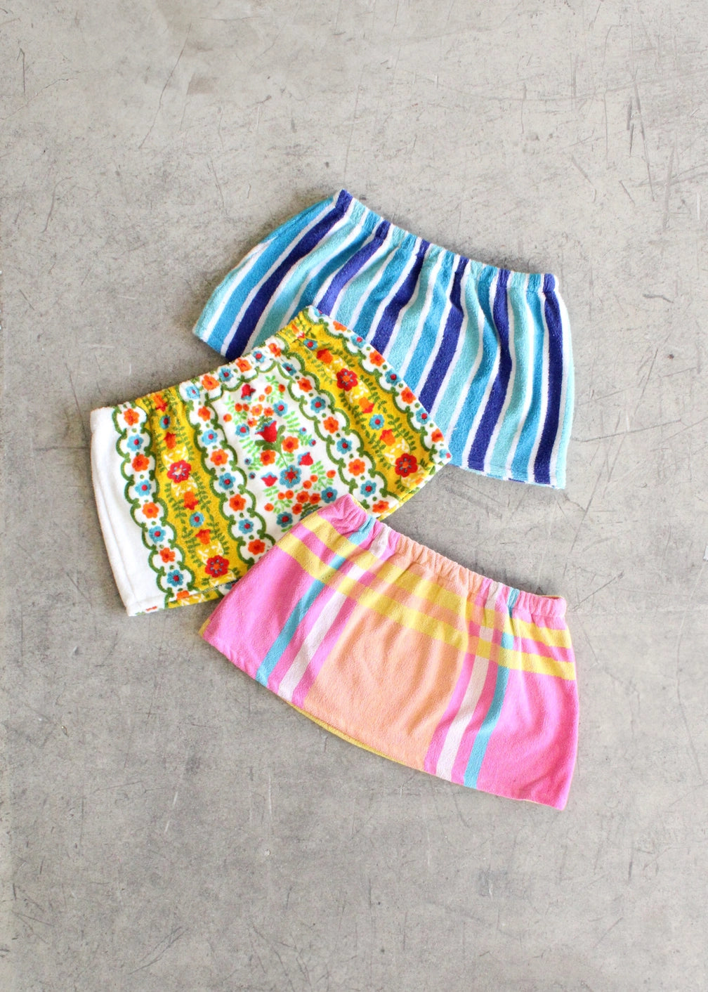 Vintage Beach Towels reworked into an elastic waist mini skirt. Each one is unique with elastic waist and perfect to wear over your swimsuit. Each piece is unique and will come with a one-of-a-kind pattern and color combinations. Sizing: SM...