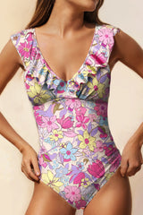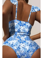 Floral two piece swimsuit with high waist, flutter ruffles on top and smocked accent. Adjustable straps on back.