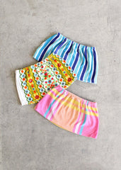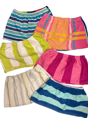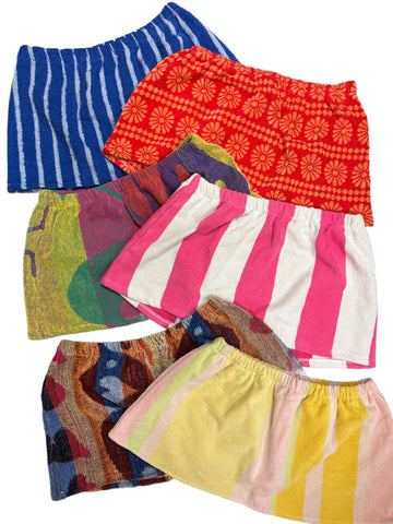 Vintage Beach Towels reworked and over-dyed into a colorful, elastic waist short. Your bundle will include a mix of tones and will be similar but not identical to the products shown. Each piece is unique and will come with a...