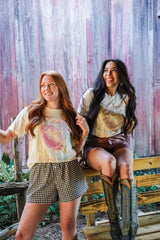 We're keeping our wardrobe on trend with our 'Floral Bronco' tee! A timeless graphic that features a vintage twist on a nostalgic design! She's hand drawn and a one of a kind graphic, printed on a beige latte tee. Comfort...
