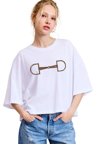 Horse Bit Western Graphic Faux Crop Oversized Top - Short Sleeve - Hits at the waist