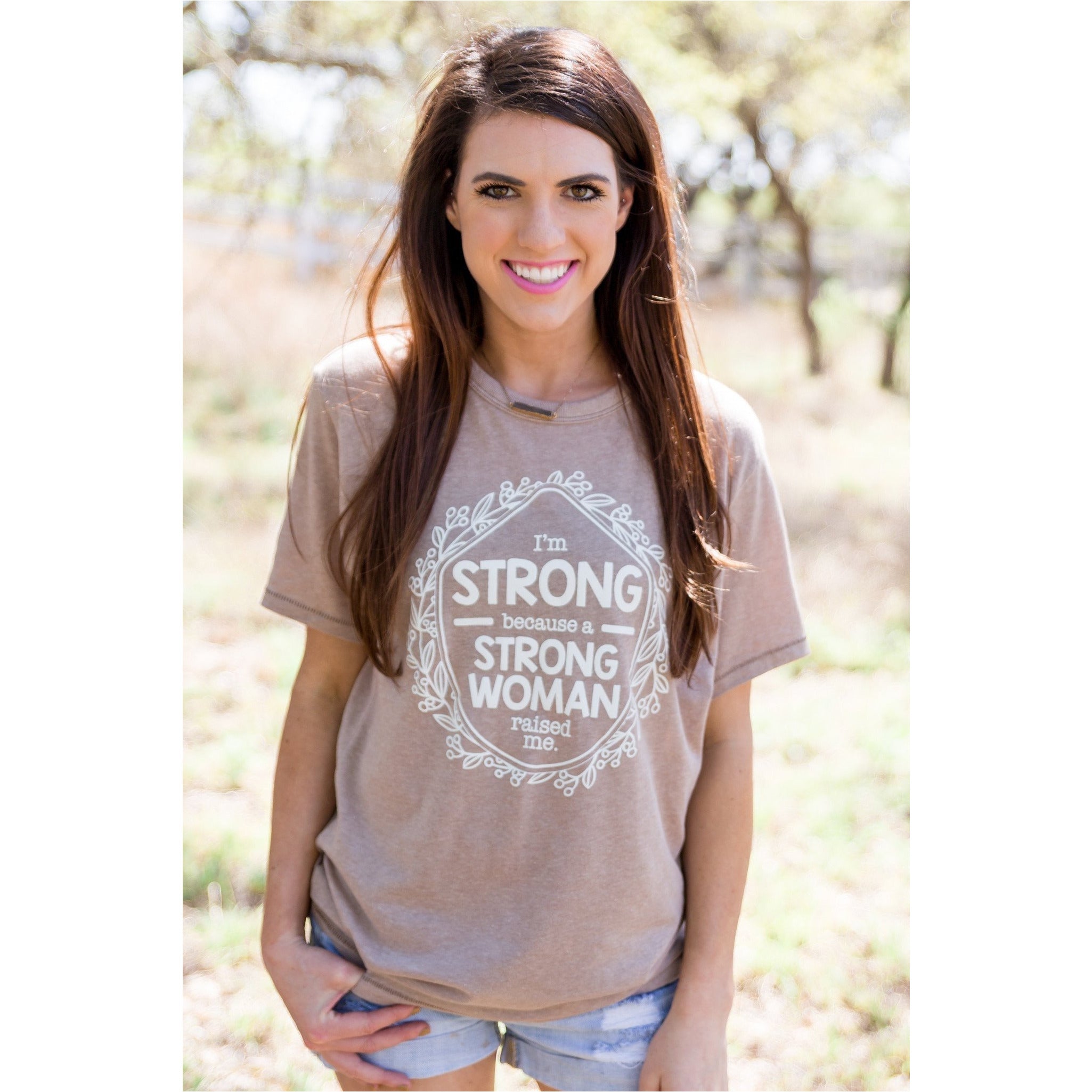 Strong Because a Strong Woman Raised Me - Short Sleeve T-shirtColor: Light Brown Heather90% Ring Spun Cotton, 10% PolyesterSizing Notes .... Small - 2/4 Medium - 6/8 Large - 10/12 XL - 14/16