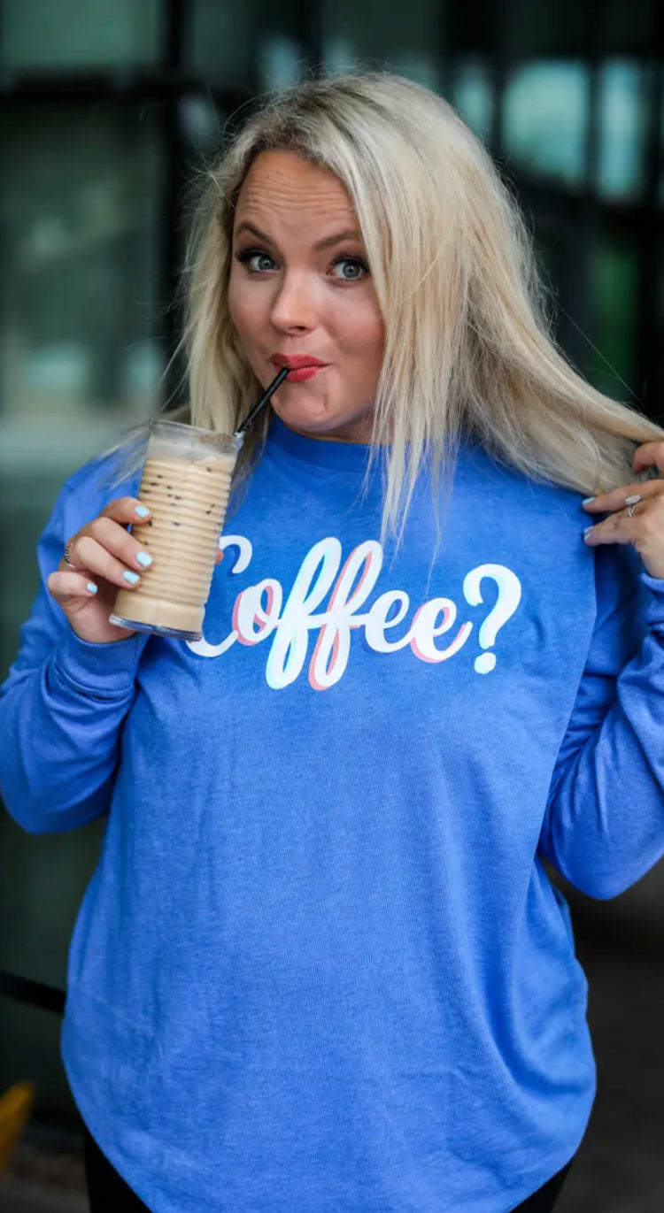 Long sleeve comfort t-shirt with Coffee screen print on front with colorful outline.