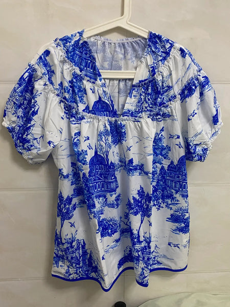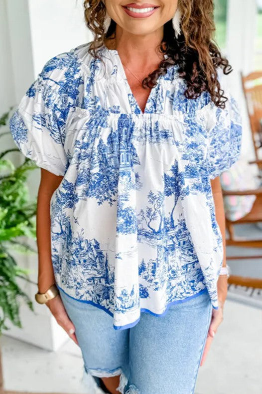 Shirred Ruffle Puff Sleeve Blue Porcelain Toile Print Blouse
