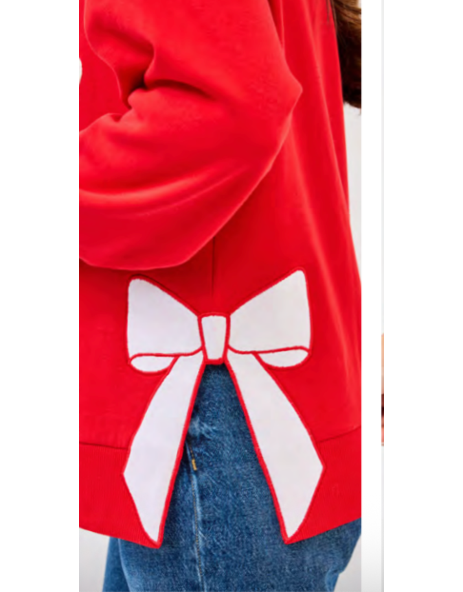 Stay cozy and festive in this bright red sweatshirt featuring playful chenille-style “Merry” lettering across the front. Designed with relaxed sleeves and a comfy fit, this holiday favorite has a fun surprise detail—a bold white bow accent along the bottom side, adding a touch of charm and whimsy. Perfect for holiday parties, casual outings, or gifting!