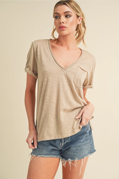 Upgrade your style with the Zoie T-shirt features a short rolled sleeves for a lived-in look and raw seam detailing at the v-neckline and short sleeves for an edgy touch.