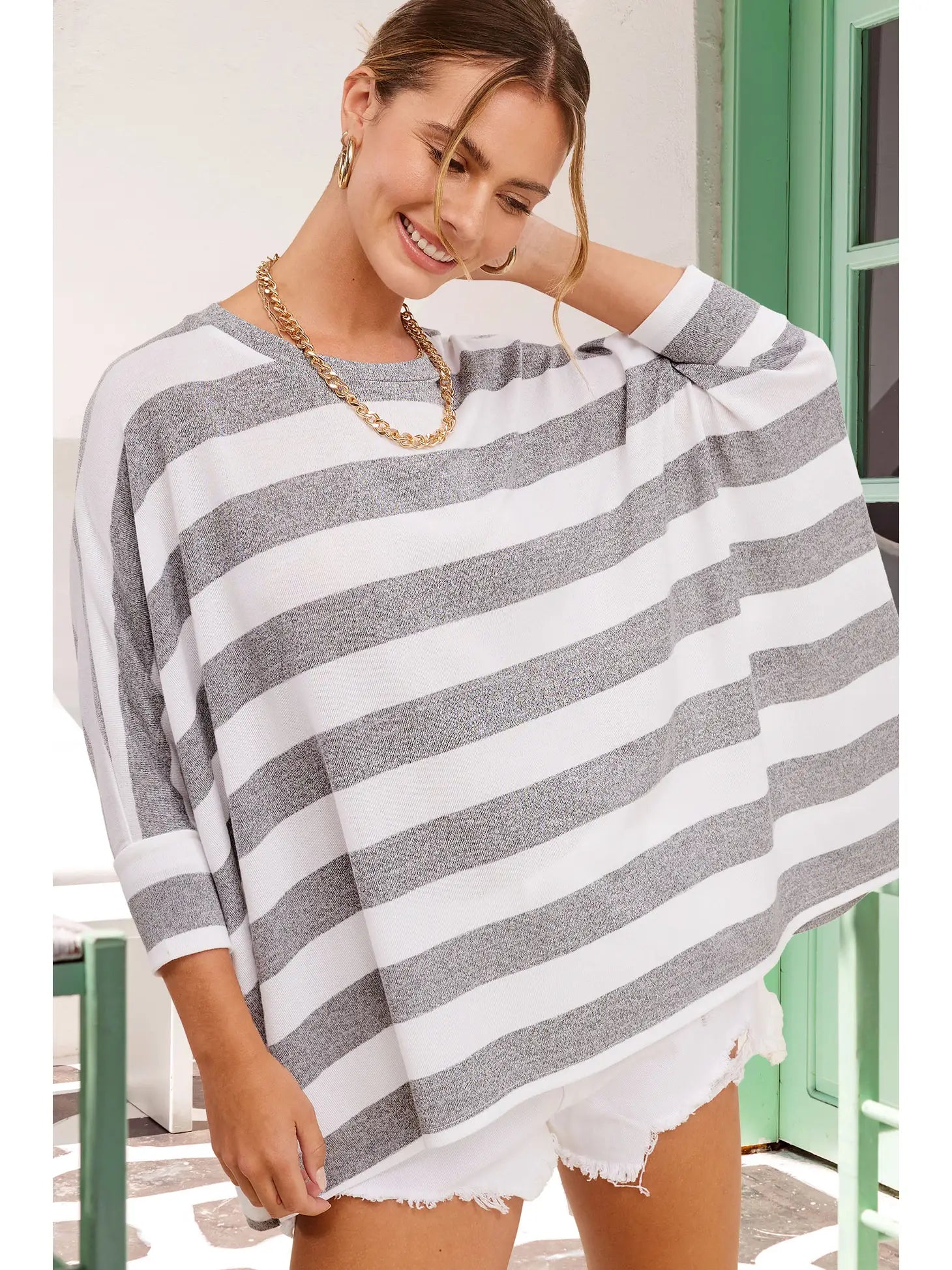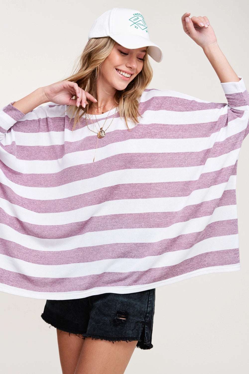 Ultra soft stripe top made of stretch fabric with a loose fit and a below hip length for versatile styling and round neckline with batwing sleeve in three-quarter length cuffed sleeve. Very Oversized and roomy Color: Berry, Gray or Navy ...