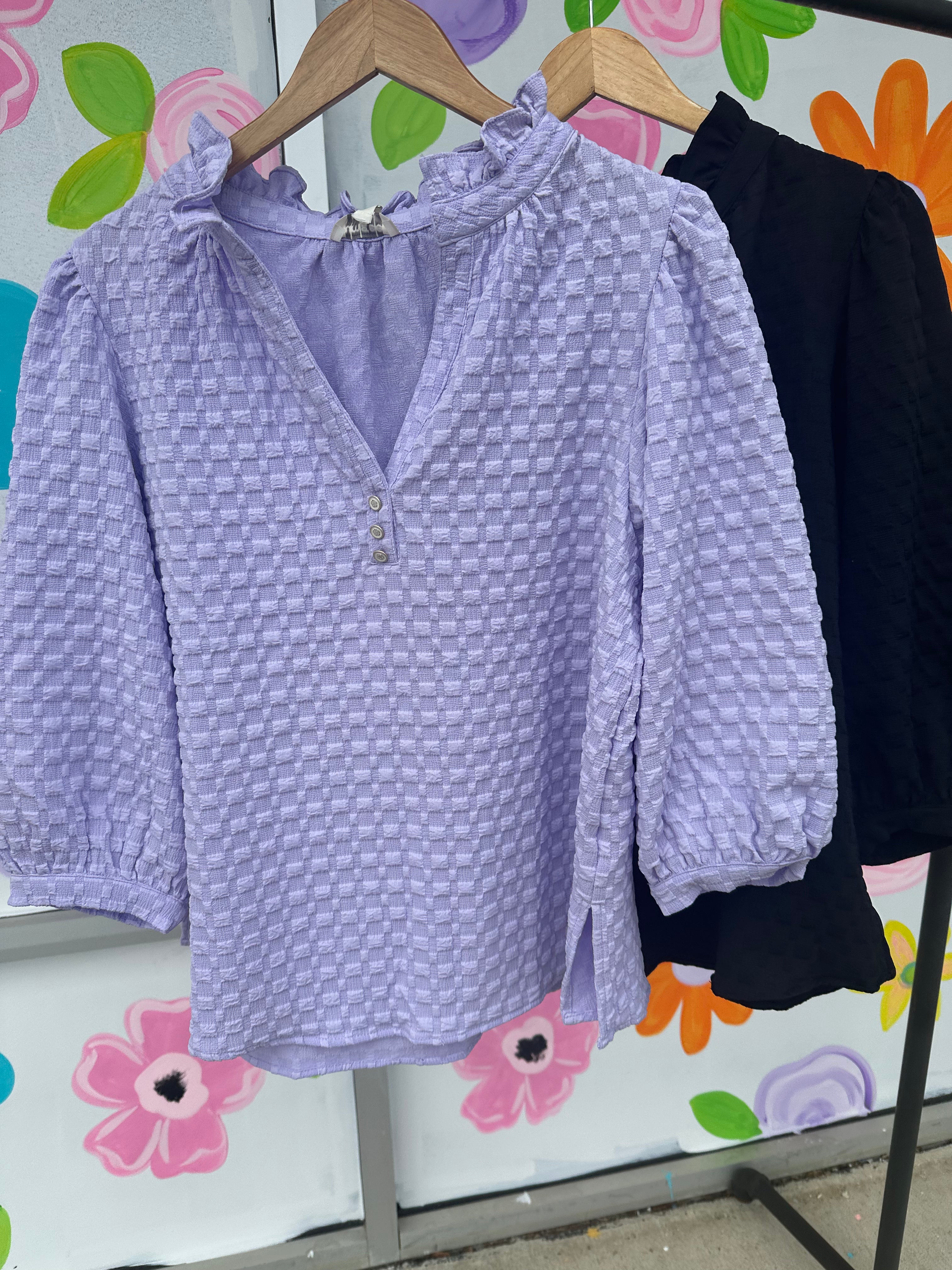 3/4 Sleeve top with cuffed sleeve and fold over ruffle collar. Relaxed Fit. Made in USA Colors: Black, Sky Blue or Lemon YellowFabric: 100% PolyesterSizing: Small (2-4) Medium (6-8) Large (10-12) XL (14-16) 1XL(18) 2XL(20)
