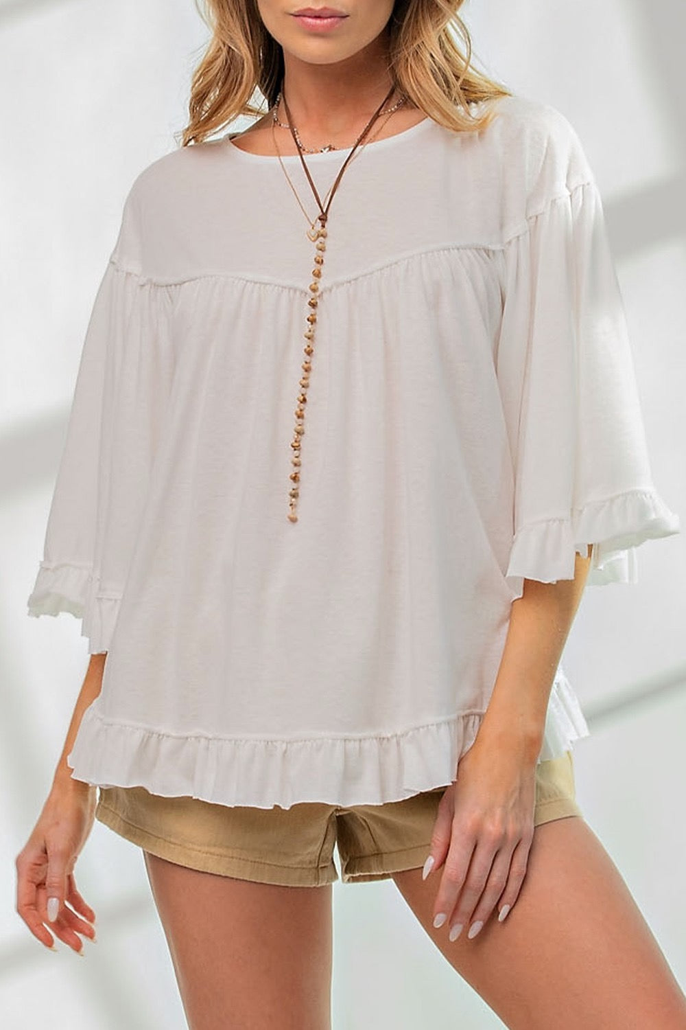 Knotted Back Ruffle Sleeve Babydoll Top. Elastic along back and sleeves for the perfect fit and to sty in place.