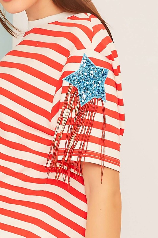 Round Neck Half Sleeve With Fringe Star Patch Stripe French Terry fourth of july Theme TopColor: Red/WhiteSize: Small(2-4), Medium(6-8), Large(10-12)Fabric: 50% POLY 50% COTTON