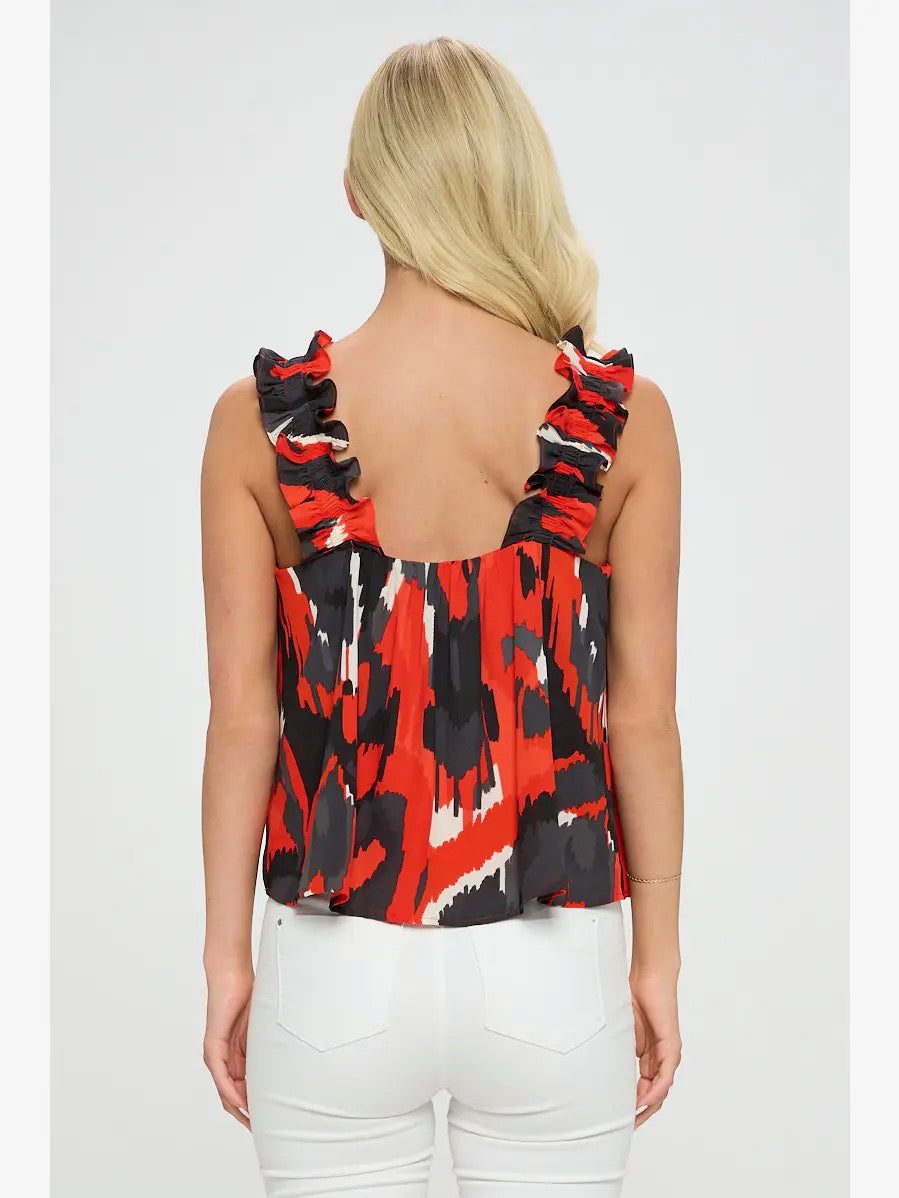 Multicolor feather print with ruffled shoulder and a mock neck.