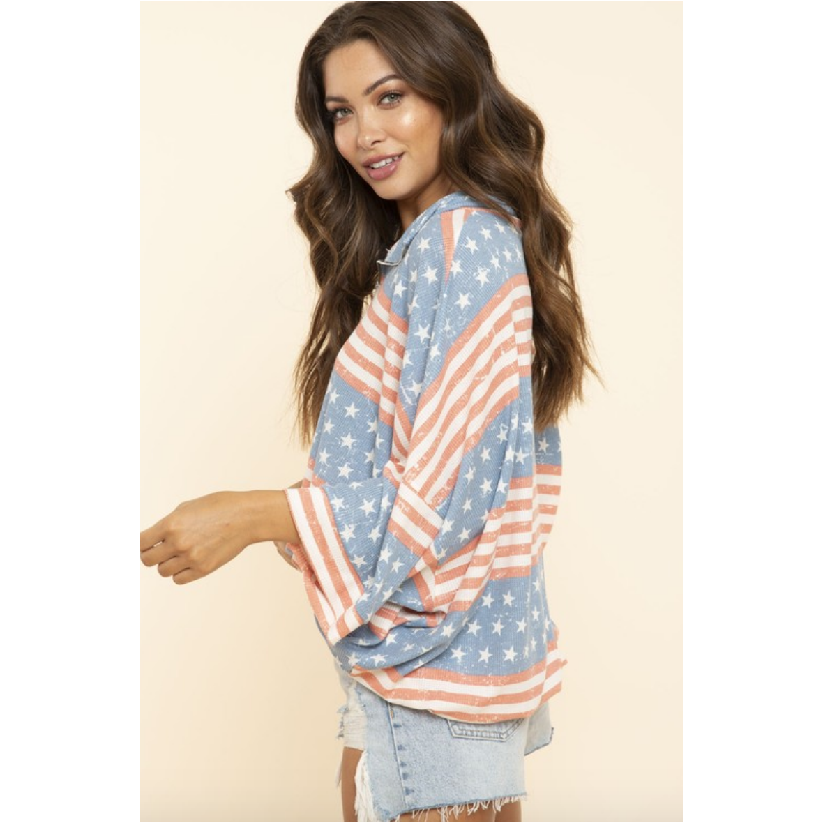 ROUND NECK LONG SLEEVE HI LOW LOOSE FIT OVERSIZED STAR AND STRIPE PATRIOTIC AMERICAN FLAG SWEATER KNIT TOP WITH SIDE SLIT