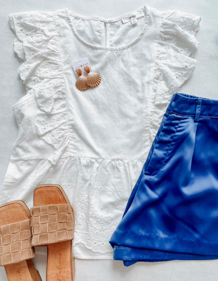 Linen Blend Short Ruffle Sleeves and Polka Dot Detail