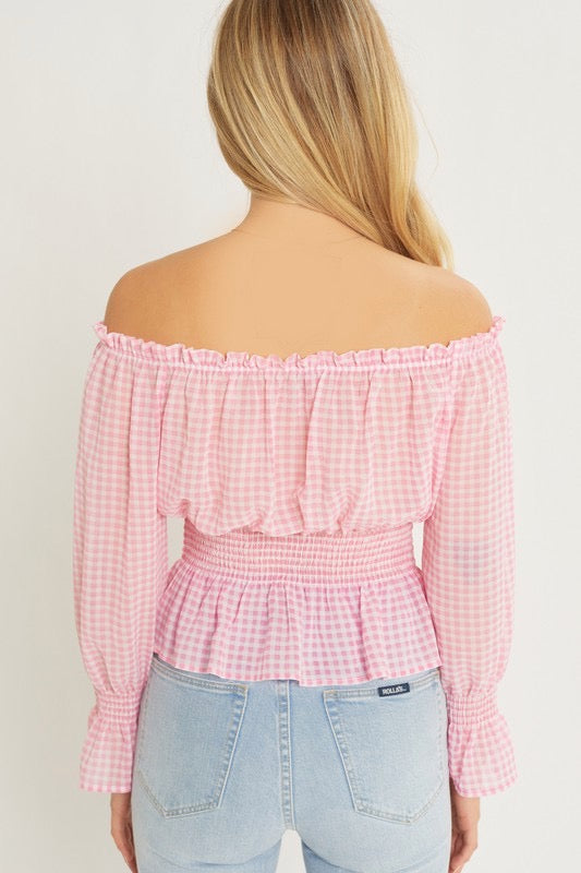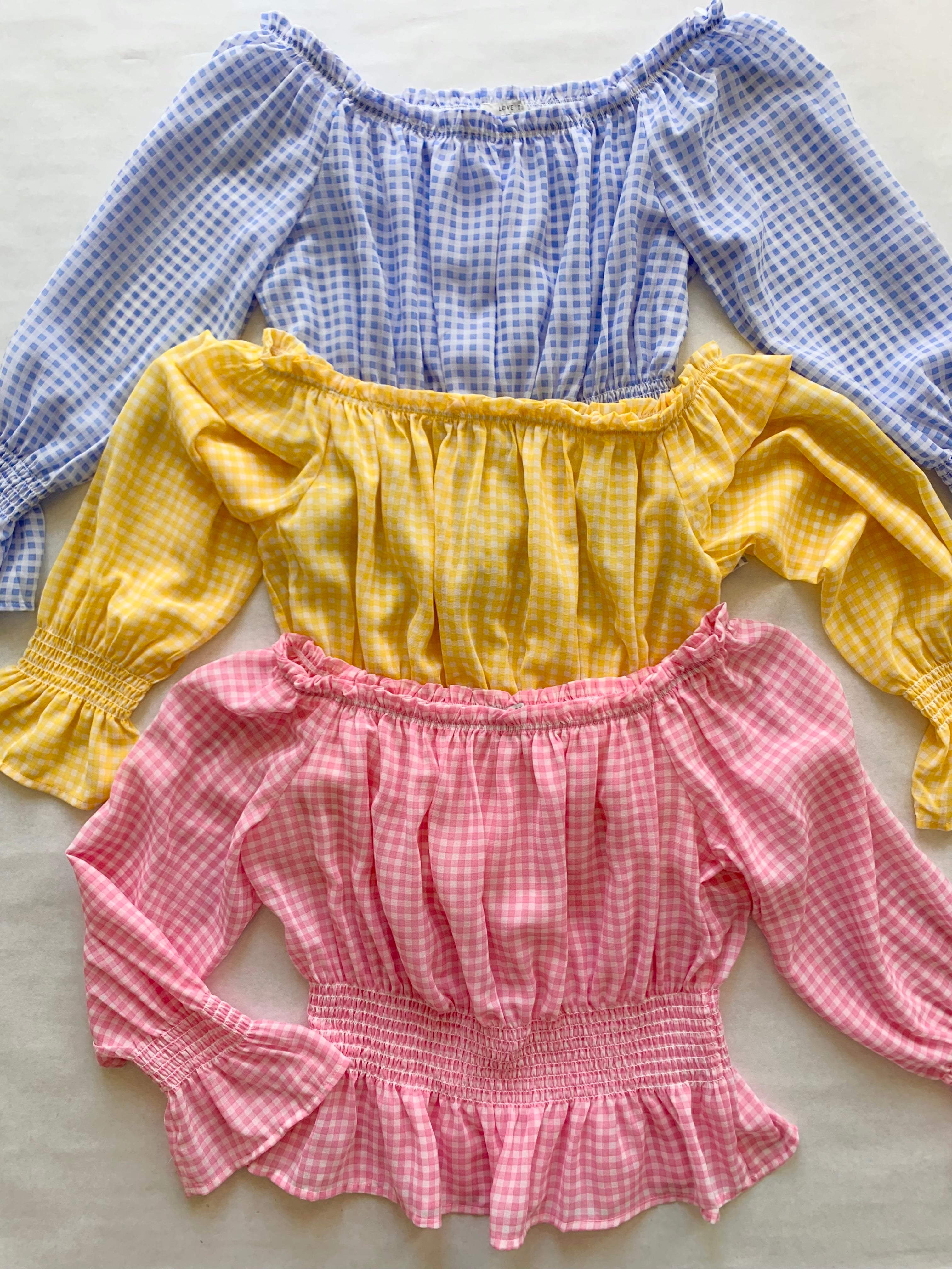 Summer classic gingham check pattern off-the-shoulder smocked long sleeve blouse