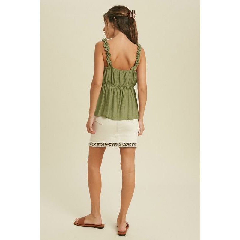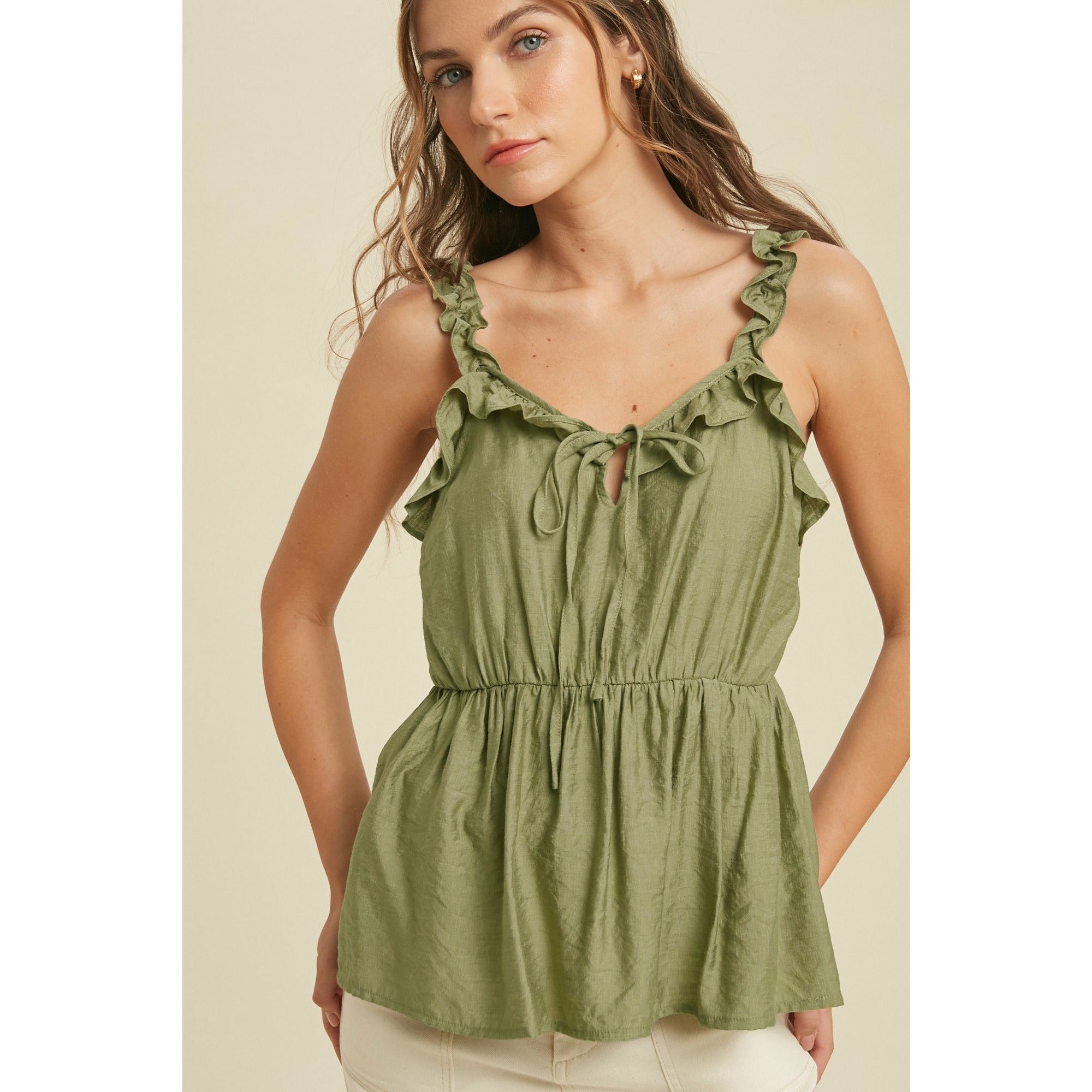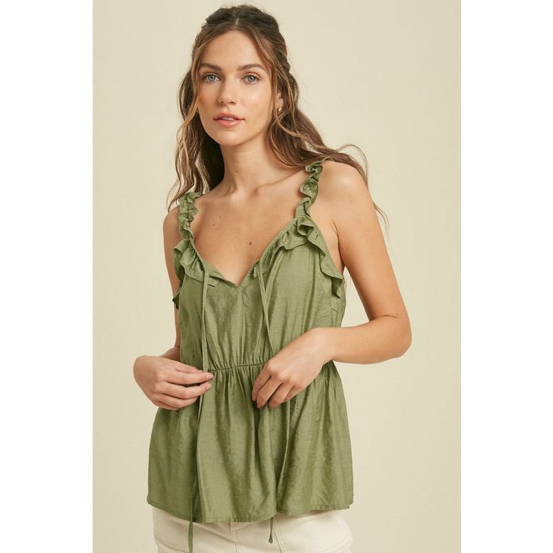RUCHED BABYDOLL STRAPPY TANK TOP- DRAPEY CRINKLE WOVEN FABRIC- SWEETHEART NECKLINE- ADJUSTABLE SPAGHETTI STRAPS- BIAS RAW EDGE RUFFLES AT TOP NECKLINE- HIGH EMPIRE WAISTLINE- RELAXED FITSELF: 100% COTTONLINING: 100% RAYON