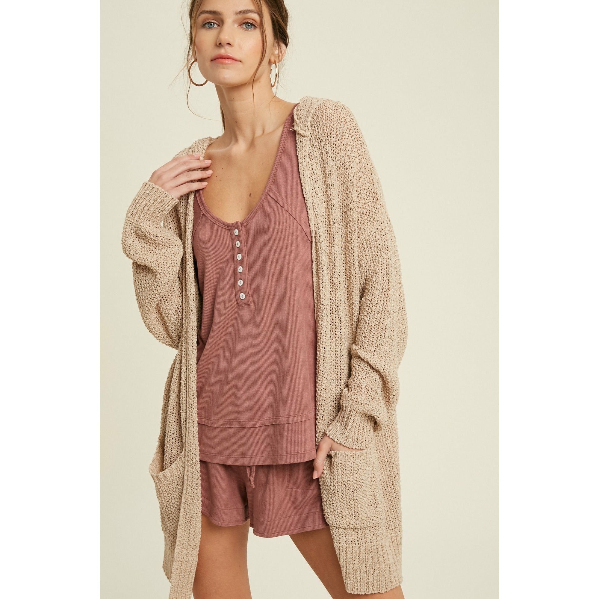 CASUAL HOODIE SWEATER CARDIGAN- TEXTURED KNIT- HOODIE DETAIL- LONG SLEEVES- RIBBED HEM AND CUFF- FRONT POCKETS- RELAXED FITFabric: 65% ACRYLIC, 35% NYLON