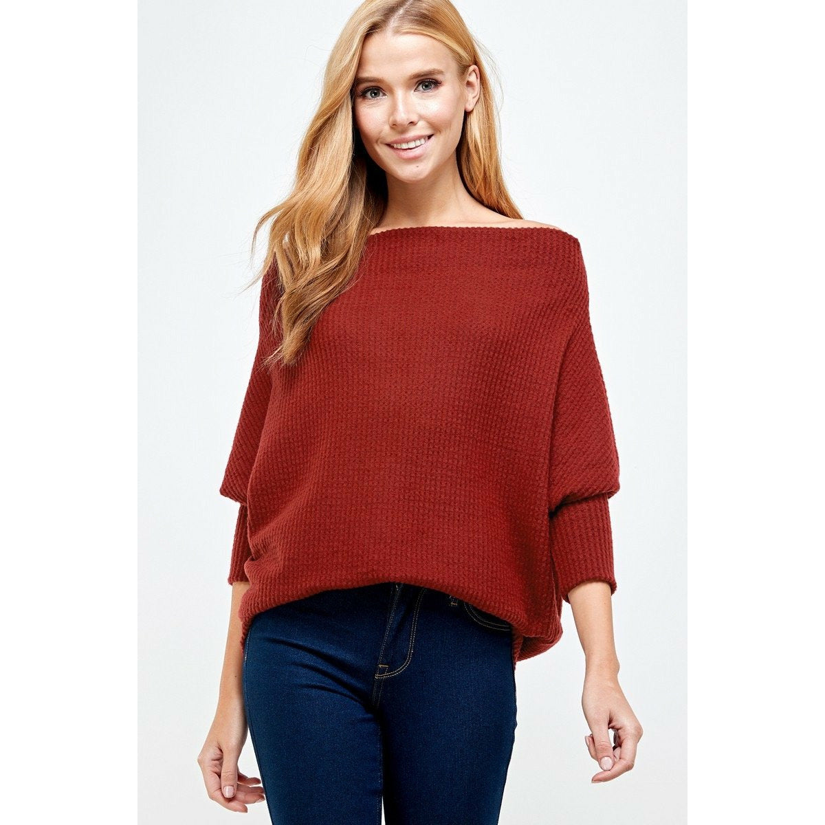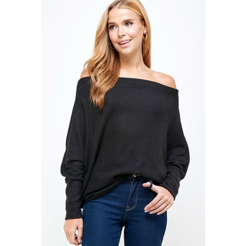Neckline can be worn off both shoulder or off one shoulderLong dolman sleeve Relaxed loose fitSolid brushed waffle knit fabric