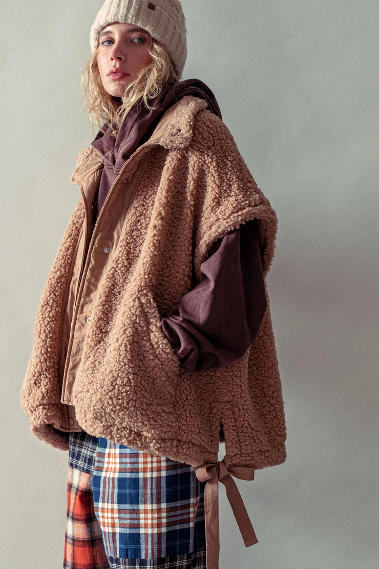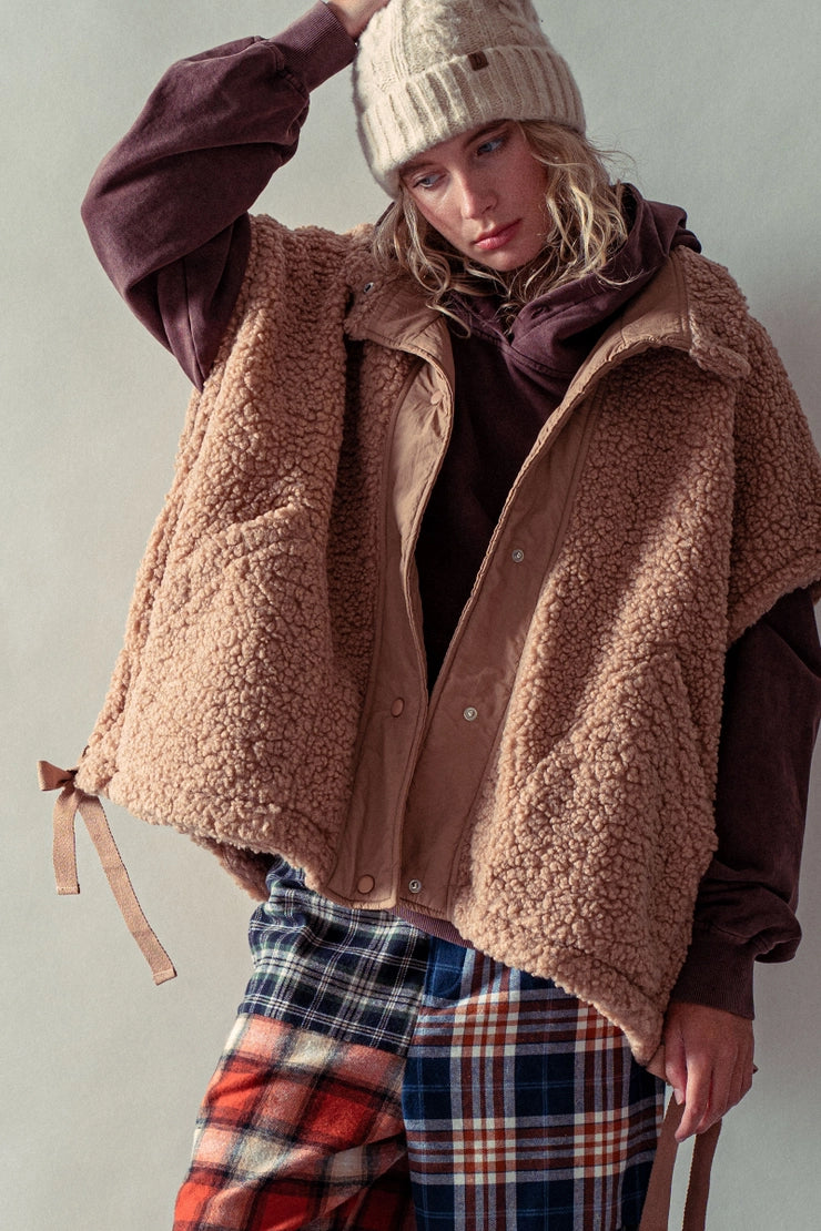 Crafted from ultra-soft sherpa fleece with a smooth inner lining, this oversized vest features roomy front pockets, adjustable side ties, and a relaxed fit—perfect for layering over dresses, rompers, or jeans for cozy-chic spring and summer style. Fabric: 100% Polyester ...