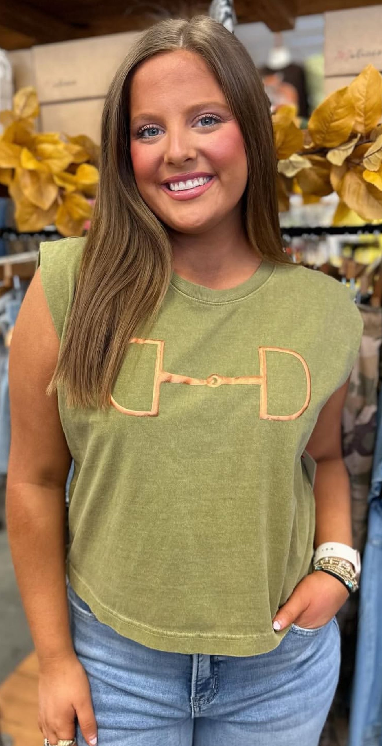 Little bit western, alot of Fabulous! Muscle tee cut this tank is boxy and runs a little big. Pair with a cardigan or wear alone. Color: Olive Green with Copper Metallic Horse Bit on Front Fabric: 100% Cotton Brand: American...