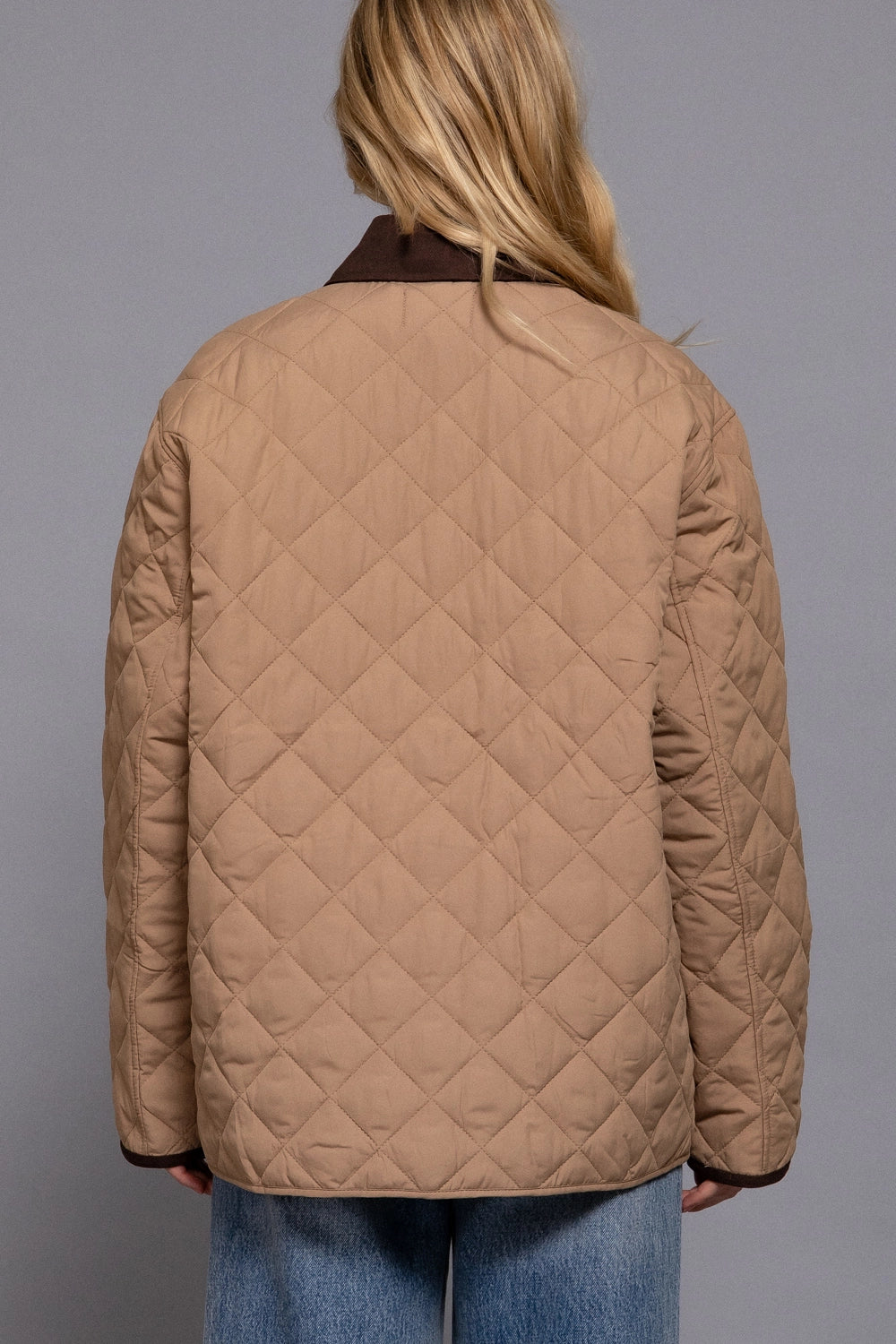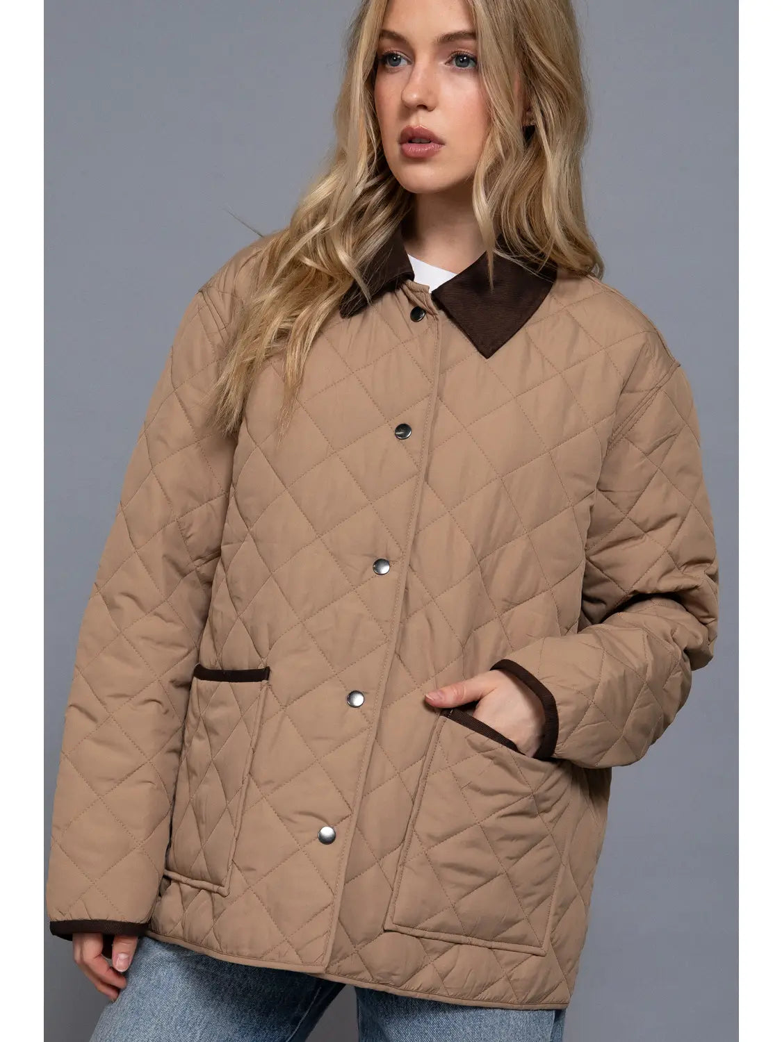 Long sleeve front snap puffer work jacket with contrasting brown color. Front patch pockets. Classic look.