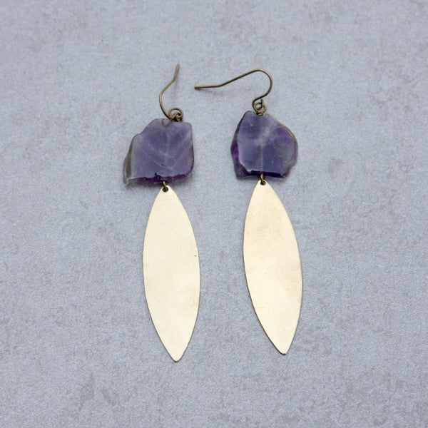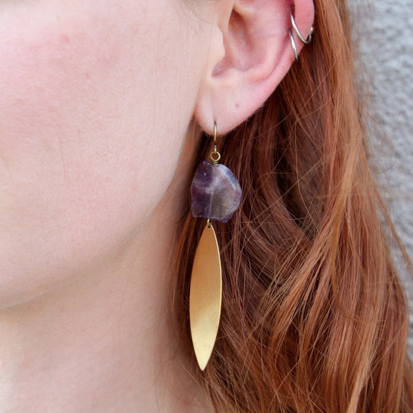There's something about amethyst and brass - the contrast between the two just compliment each other. An elevated dangle earring, these amethyst and tear drop earrings are part of the charm and found object collection. Each created with a unique amethyst stone, raw brass tear-shaped charm and finished with antique gold-plated earwire. Simple, but special, they have a variable length of 3 to 3 3/4 inch drop with a 1/2 inch width.Sizing Details
