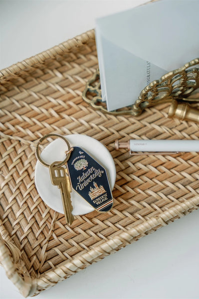OFFICIALLY LICENSED BY AUBURN UNIVERSITY Enamel keychain featuring Auburn University's Samford Hall and Toomer's oak trees in a motel keychain shape! * 2.5" enamel keychain with gold loop * Packaged in cello sleeve with backer board