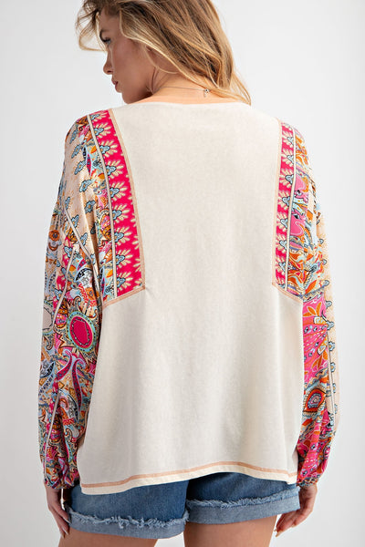 PRINT MIX COTTON SLUB KNIT TOP - thin and light weight -ROUNDED COLORBLOCK NECKLINE -STITCH DETAILING -ELASTIC CUFFS -DROPPED SHOULDERS -MIX PRINT SLEEVES -LOOSE AND RELAXED FIT