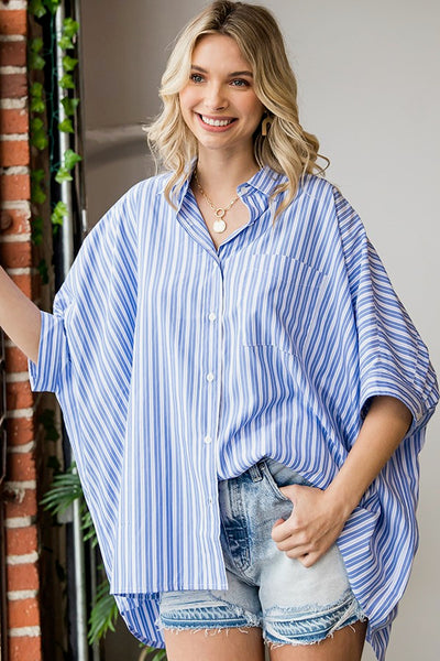 STRIPED BUTTON-DOWN OVERSIZED SHIRT FEATURING BUTTON CUFFED SHORT SLEEVES,