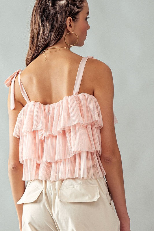 SHOULDER TIE STRAPS SQUARE NECK LINE FRONT AND BACK MESH TIERED SLIGHTLY CROP TANK TOP
