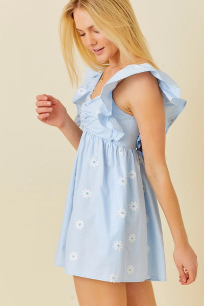 "Get ready to bloom in the Daisy Daze Romper! This playful romper features ruffle shoulder detailing and shirring for a babdoll fit. Made from 100% cotton, it's the perfect combination of comfort and style. Stay cool and chic all day long!"