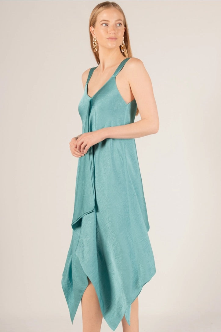 Indulge in the luxurious feel of our Dance The Night Away Dress. Made from textured satin, its sharkbite hem and sleeveless design exude elegance and grace. The midi length and V-neck add a touch of sophistication to this timeless piece. Perfect for dancing the night away in style.