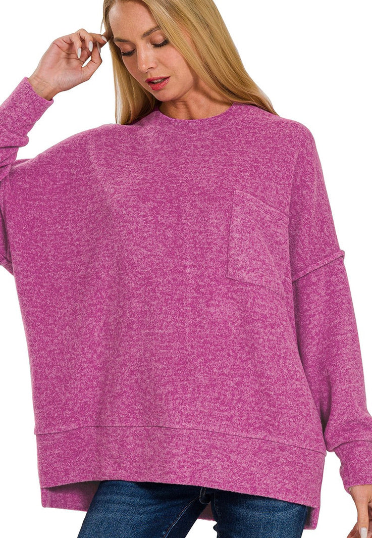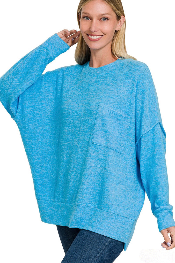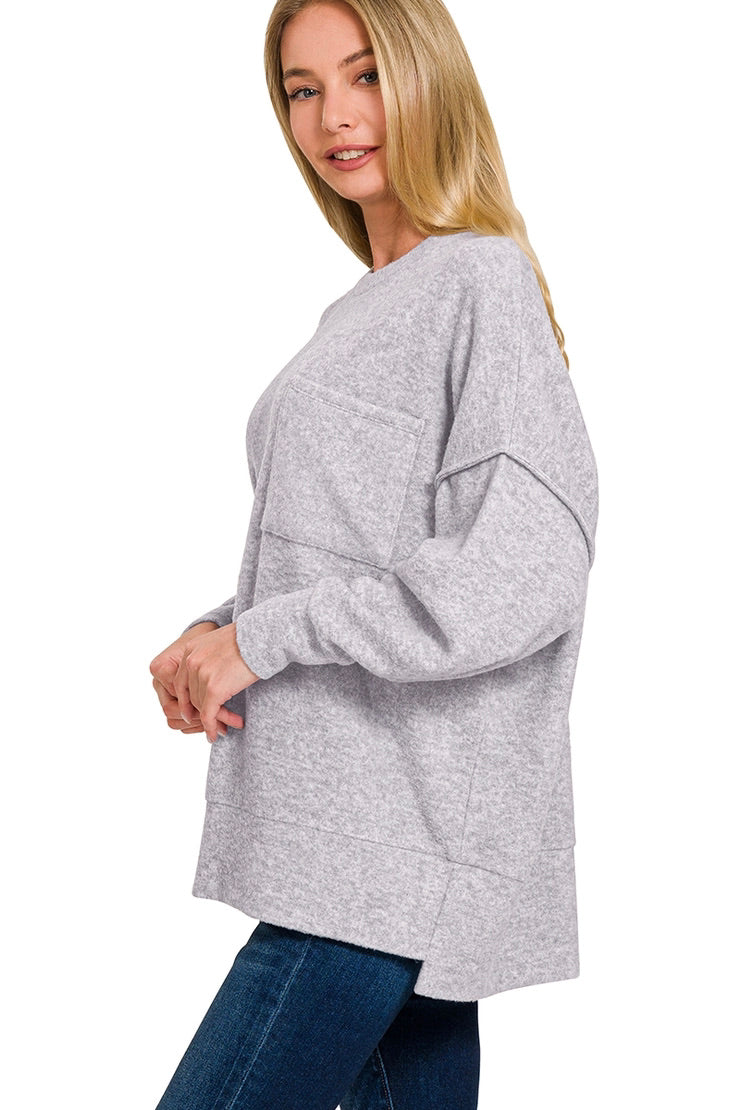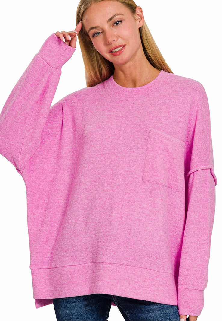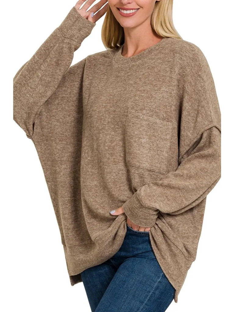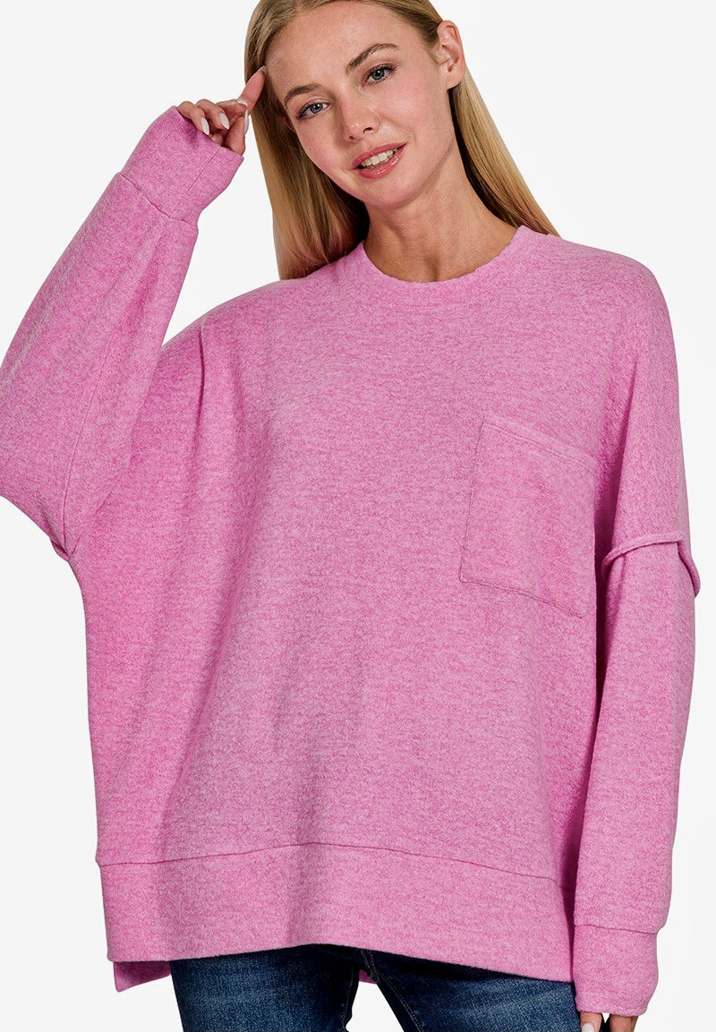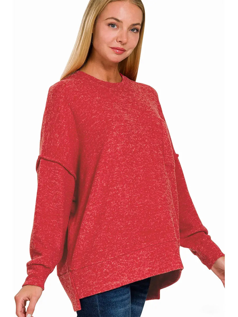 This cozy brushed melange top, available in multiple options, is perfect for days like this. With a drop shoulder design and oversized fit, it offers both style and comfort. Stay warm and stylish all at once with this must-have essential.