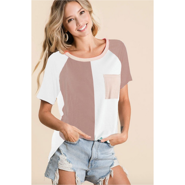 JERSEY KNIT TOP COLOR BLOCK RAGLAN SLEEVES AND FRONT POCKET.