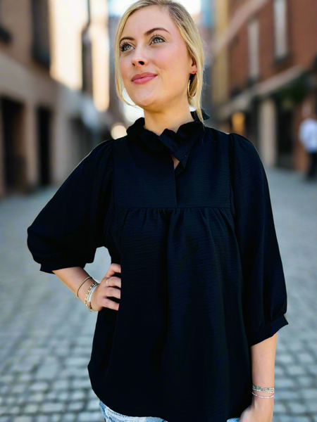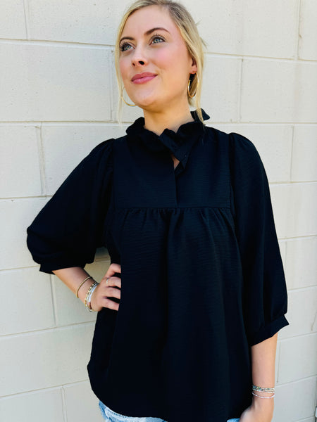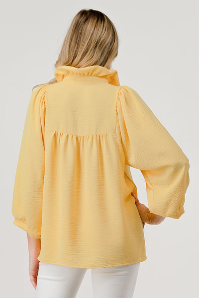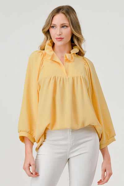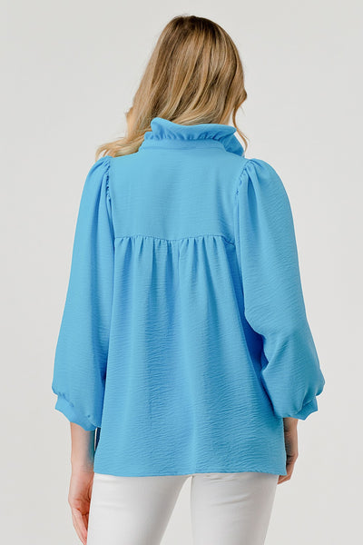 3/4 Sleeve top with cuffed sleeve and fold over ruffle collar.