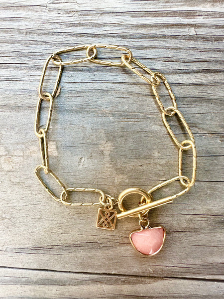 Gold paperclip bracelet with toggle closure and peach colored half moon stone