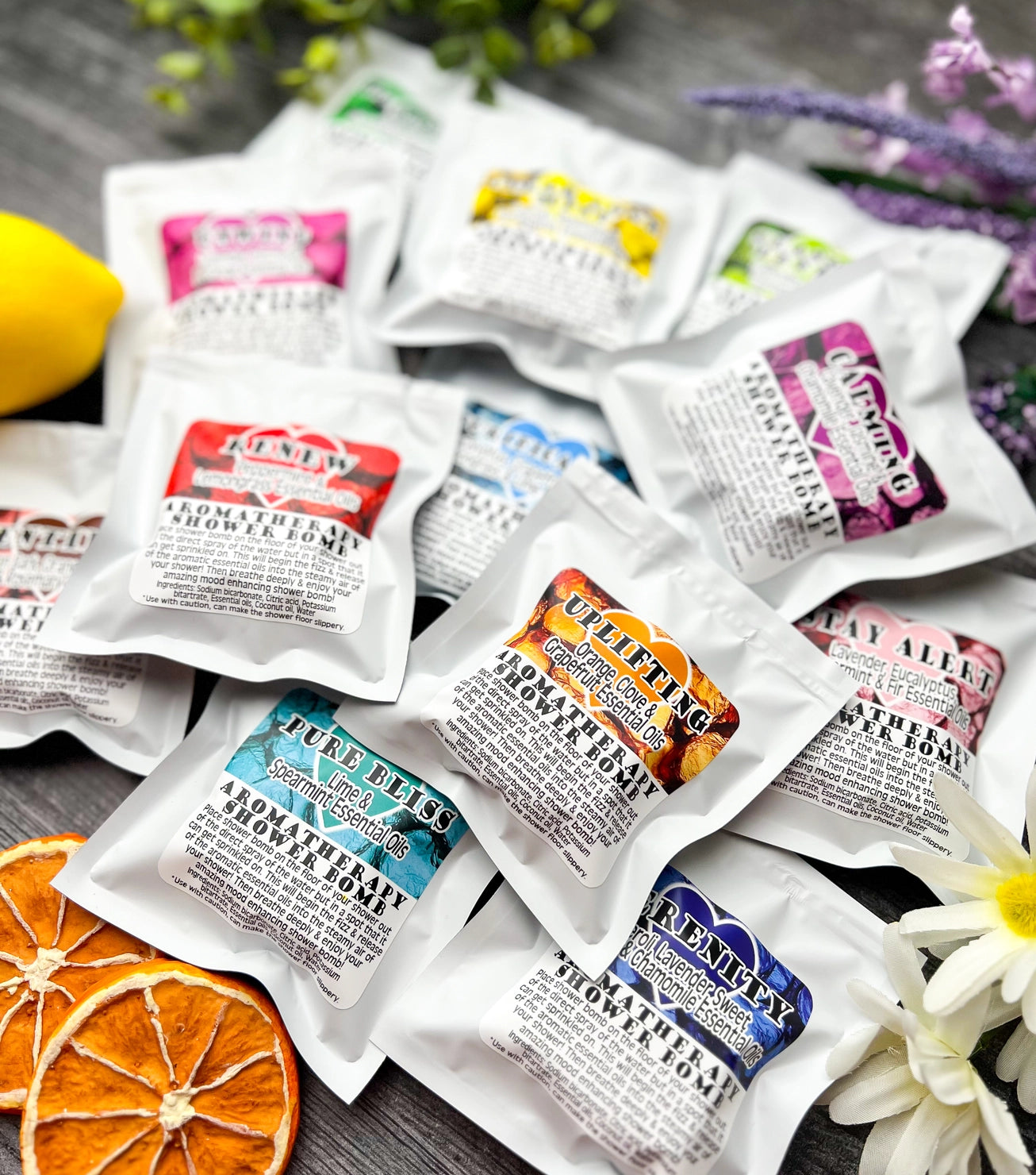 A customer favorite!!! We can't keep these in stock! Make your shower into the spa experience you need most that day. Need to calm down & relax? Try Calming or Unwind. Need to wake up & get started in the morning? Try Uplifting or Clear Your Mind. Need to open up your airways & breathe better? Try one of our MOST popular Headache & Sinus Shower Bombs & our New Allergy Blend Seasonal Defense! *Everyone loves to turn their shower into a perfect spa getaway!!! Each bomb is a blend of the essential oils listed with them. See the Ingredients Picture for exact essential oil blends & their names. Our Aromatherapy Shower Bombs are Essential Oil-based, perfect for you to enjoy during every shower. Single shower bombs in your chosen scents. SAFETY: Like all bath & body products, take care, these can possibly make your shower slippery.