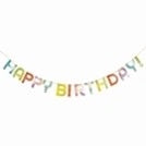 14-piece Happy Birthday paper fringe party banner. Metallic fringe letters. Metallic gold cord for stringing included.Sizing Details