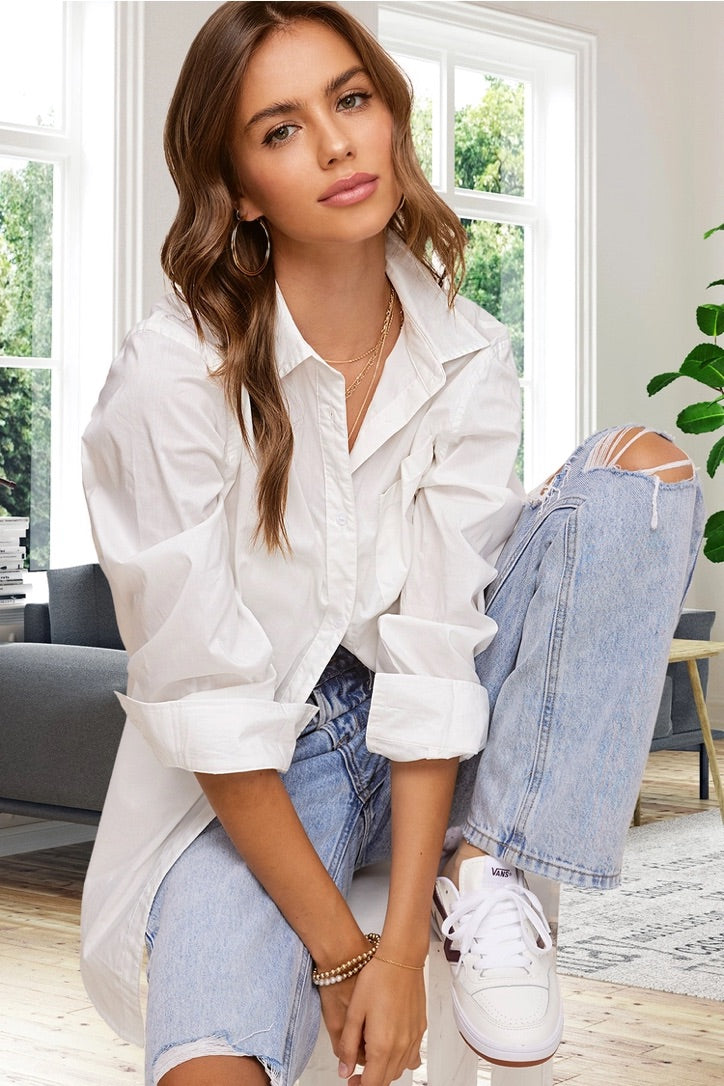 Classic and versatile button-down top featured in a boxy & oversized silhouette with classic collar detail and a front pouch pocket. Fabric is a lightweight and breathable texture. It provides a smooth and lustrous finish, making it the ideal choice for both formal occasions and everyday wear. Whether you're heading to the office, attending a formal event, or simply want to add a touch of sophistication to your daily attire, these shirts are the perfect choice for effortless elegance.
