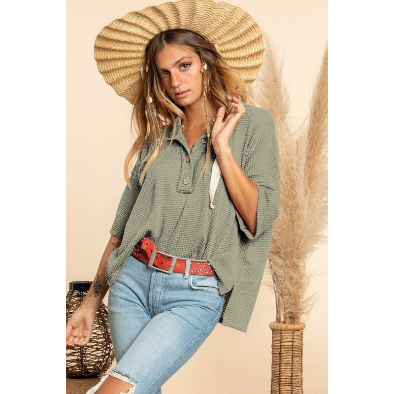 Short Sleeve Boxy cut Waffle Top with Large Wooden Buttons